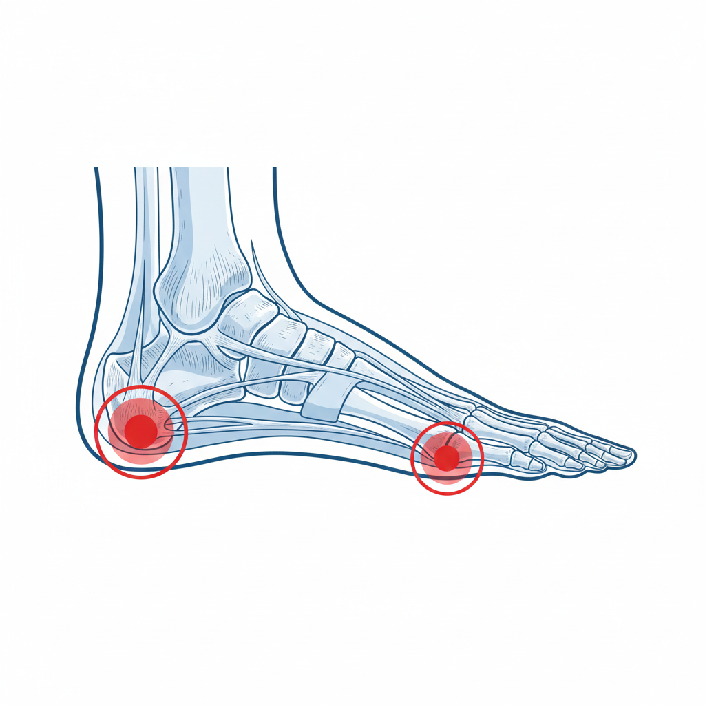 Düz taban veya yüksek kemer → Baskı yanlış dağılıyor → Topuğa fazla yük → İltihap → AĞRI